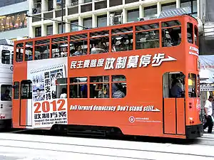 Pan-democrats all agreed that the proposals do not go far enough, but were divided on what action is needed.[7] Significantly, the Democratic Party opted to engage with Beijing to negotiate, parting company with the Civic Party and the LSD. In January 2010, five legislators from the Civic Party and the LSD resigned their seats as part of the 'Five Constituencies Resignation' concept for meaningful political reform; Albert Chan, Alan Leong, Tanya Chan, "Longhair" Leung Kwok-hung and Wong Yuk-man resigned from LegCo.[8] Their resignations were submitted on 26 January 2010, with effect on 29 January 2010.[9] Beijing warned the five legislator not to resign. Chief executive Donald Tsang said the "so-called referendum" had no legal grounding.[10] The resignations precipitated a by-election throughout the territory which takes place on 16 May 2010.