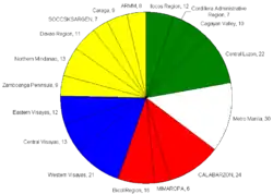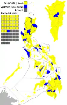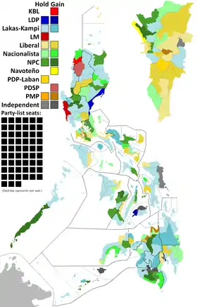 ![]() District election results (80% of the seats), with Metro Manila on the inset, and party-list seats indicated by black boxes.