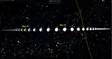 On 15 May 2018, 22:05 UT, the asteroid approached Earth at just over 0.5 LD, the closest approach of this asteroid in nearly 300 years.[3] It was expected to reach apparent magnitude +11 at closest approach,[10] bright enough to be seen in a small telescope if you have a custom ephemeris for your location. At closest approach, it was best seen from the Southern hemisphere such as South Africa and southern South America. The asteroid passed Earth going 12.81 km/s (28,700 mph).[4]