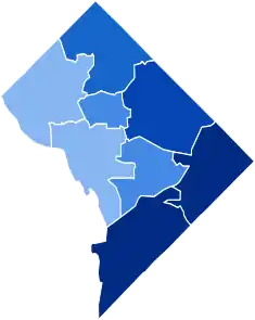 On September 15, 2010, voters went to the polls and the District of Columbia Board of Elections and Ethics reported unofficial results, with Gray receiving 53 percent of the vote compared to Fenty's 46 percent.[22] Gray won as much as 80% of the vote in predominantly black areas east of the Anacostia River, but did poorly in the city's wealthier northwest, winning just 13% in one Georgetown precinct.[23]