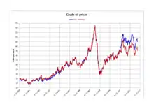 On July 10, oil prices were the highest in more than a year as a result of lower supplies and trouble in Egypt. In the past week, Brent crude had climbed 7% to $108.51. Because too much oil was being produced for the infrastructure to handle it, West Texas Intermediate was lower than Brent crude for several years; it has returned to being consistent with Brent.[66][67] On July 5 it reached $103.22.[68] On July 19 with good economic news in the United States, Benchmark crude reached $108.05, while gas was $3.67, the highest on a Friday since March 22. Brent crude was at $108.07.[69] Gas was $3.63 on August 1, though good economic news in the U.S., China and Europe meant oil was going up again after a decline the previous week. Benchmark crude reached $107.89, while Brent crude was $109.54.[70] On August 16 Benchmark oil was $107.46 after six days of increases as Egypt's problems continued. The concern was access to the Suez Canal, which appears unlikely to be a problem but still concerns companies. Brent crude was $110.48 on August 19.[71] On August 28 West Texas intermediate reached $110.10, the highest since May 2011, and Brent crude reached $116.61, its highest point since February 19, due to concern about U.S. involvement in Syria. Meanwhile, inventories in the United States had their biggest increase in four months.[72] Benchmark crude rose to $107.56 on September 11 due to lower supplies after dropping due to hopes for a peaceful Syria solution; Brent crude rose to $111.50.[73]