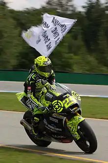Andrea Iannone, celebrating with a flag after winning the Moto2 race.