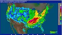 From April 14–16, the storm system responsible for one of the largest tornado outbreaks in U.S. history also produced large amounts of rainfall across the southern and midwestern United States. Two more storm systems, each with heavy rain and tornadoes, hit in the third week of April. In the fourth week of April, from April 25–28, another, even more extensive and deadly storm system passed through the Mississippi Valley dumping more rainfall resulting in deadly flash floods.[18] The unprecedented extensive rainfall from these four storms, combined with springtime snow melt from the Upper Midwest, created the perfect situation for a 500-year flood along the Mississippi.