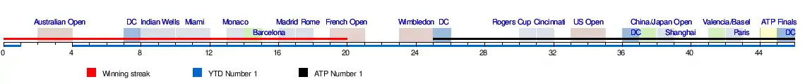 The 2011 Novak Djokovic tennis season is widely regarded as one of the greatest seasons ever in men's tennis.[5] He ended the year with an impressive 10–1 record against Rafael Nadal and Roger Federer. From the start of the year, he remained undefeated until the French Open semifinals in June (loss to Federer), compiling a 41-match winning streak. Djokovic won ten tournaments, three of them Grand Slam events: the Australian Open, Wimbledon Championships and the US Open.[5] He won a then record (since broken by himself) five Masters Series 1000 titles: Indian Wells, Miami and Canada, played on hard courts, and Madrid and Rome, on clay.[6] Djokovic also won in Dubai and at the Serbia Open.