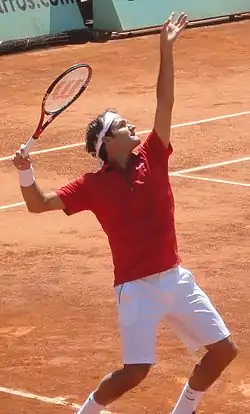 Federer began the year ranked as the world no. 2 according to the Association of Tennis Professionals rankings.[2] Federer once again started his year with an exhibition tournament in Abu Dhabi. He beat Robin Söderling in his opening match,[3] before losing to Rafael Nadal in his second match.[4] Federer then got his competitive season underway in Doha. In the first two rounds, Federer beat two qualifiers.[5][6] The first match was memorable, as Federer pulled off another "tweener", a shot between the legs.[5] Federer defeated Viktor Troicki in the quarterfinals[7] and Jo-Wilfried Tsonga in the semifinals, both in straight sets.[8] Federer then went on to beat Nikolay Davydenko in straight sets for his third title in Doha and the 67th of his career.[9]