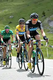 Appollonio took his first victory as a professional during June's Tour de Luxembourg, winning a bunch sprint into Roost.[56] A fifth-place finish the following day, on the final stage, ensured that Appollonio won the points classification, taking the jersey from Team Katusha rider Denis Galimzyanov.[57] Consistent finishing from Wiggins at the Critérium du Dauphiné earned the team their first overall race win at World Tour level. After finishing third in the opening prologue, Wiggins placed second behind Tony Martin (HTC–Highroad) on the third stage time trial, held over the course that would later be used for the penultimate day time-trial of the Tour de France, to take the overall lead by over a minute from nearest challenger, BMC Racing Team's Cadel Evans.[58] Wiggins took sixth-place finishes on stages 5 and 6, and with a tenth place on the final stage, secured the overall win by 86 seconds ahead of Evans.[59] Boasson Hagen also added World Tour points with third behind Wiggins in the time trial, and second to HTC–Highroad rider John Degenkolb on stage 4.[60]