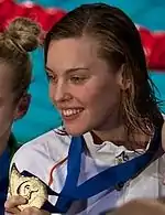 On the seventh day of competition on July 30, six finals were contested, the women's 50 m butterfly, men's 50 m freestyle, women's 200 m backstroke, men's 100 m butterfly, women's 800 m freestyle, and the women's 4×100 m medley relay. In the first final of day seven, the women's 50 m butterfly, Dutch swimmer Inge Dekker pulled an upset and won the gold ahead world record holder Therese Alshammar 25.71 to 25.76.[26] In the men's 50 m freestyle, Brazilian César Cielo successfully defended his 2009 title with a win in a time of 21.52.[27] In the women's 200 m backstroke, American Missy Franklin dominated the competition with a national record time of 2:05.10, almost a second ahead of second-place finisher Belinda Hocking and nearly breaking the world record set in 2009.[28] Franklin's time of 2:05.10 is the third-fastest ever in the event. In the men's 100 m butterfly, American Michael Phelps won the expected gold in a time of 50.71, his third consecutive title in the event (also winning in 2007 and 2009) and second individual title of the meet.[29] In the women's 800 m freestyle, Brit Rebecca Adlington was able to hold off Dane Lotte Friis for the win with a time of 8:17.51. Friis finished second with a time of 8:18.20.[30] In the final event of day seven, the women's 4×100 m medley relay, the American team of Natalie Coughlin, Rebecca Soni, Dana Vollmer, and Missy Franklin won the gold with a time of 3:52.36, over three seconds ahead of second-place finisher China. Their time was the second-fastest of all time and was just outside the Chinese owned world record of 3:52.19 from 2009. It was the first title for the American team since 1998. Notably, Franklin, who had just completed the 200 m backstroke, completed the freestyle leg in the medley relay in 52.79, the fastest freestyle leg in the field.[31] No new world or competition records were set during day seven.