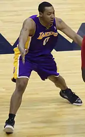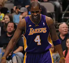 With Nash still out, D'Antoni started 2–3 as a Laker, a minimal improvement over Brown's 1–4 start.[50] The team had been struggling to get the big men Gasol and Howard involved in the new offense.[51] Bryant was also adjusting, running more screen-rolls and fewer post ups than at any time in his career.[52] Additionally, backup point guard Steve Blake had been out since an abdominal injury on November 11, and he would not return until late January.[53] On November 30, the Lakers made 17 three-point field goals—tying a team record for a regulation game—in a 122–103 win over the Denver Nuggets. Free agent acquisition Antawn Jamison scored 33 points, the first time a Laker had scored 30 points as a reserve since Shaquille O'Neal in 1998. Jamison also made five three-pointers, while Jodie Meeks scored 21 on a career-high seven three-pointers. Howard even added the second three-pointer of his career in addition to his 28 points and 20 rebounds.[54] They lost 113–103 to the Orlando Magic the following home game in Howard's first matchup against his former team. He had 21 points and 15 rebounds, but he was intentionally fouled and shot only 9–for-21 on his free throws.[55]