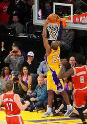 The Lakers lost on New Year's Day, and their 15–16 record matched their worst start after 31 games since the 2002–03 season.[66] According to Bryant, the team lacked energy "because we're old as ..."[67] Prior to their second meeting with their crosstown rivals on January 4, the Clippers were 25–8 and fighting for the best record in the league, while the Lakers were nine games behind the Clippers and looking to secure a playoff spot in the Western Conference.[68] For only the fourth time in their prior 127 meetings since they moved to Los Angeles, the Clippers had a better record than the Lakers entering their matchup when both teams had played 30 or more games.[69] Bryant called the Clippers "top contenders" for a championship before the Lakers lost again to the Clippers.[68][70] Kupchak told Lakers season-ticket holders the team needed Gasol to be more involved, and the Lakers needed to play better defense. He did not believe that the team, whose roster's average age was 28.5, was too old to win a championship.[71] The Lakers followed with a home loss to Denver, when Lakers fans revived the "We Want Phil" chants from two months earlier.[72] It was their fourth loss in five games, dropping them to 15–18 and 11th place in the West, three games behind the Portland Trail Blazers for the eighth and final playoff spot.[73] Nash estimated the Lakers would need a minimum of 45 wins to qualify for the playoffs, which would require the team go 30–19 (.612) the following 49 games after playing .455 ball in their first 33 games.[70] After the Denver game, Howard had his right shoulder heavily wrapped in ice. He had played through an injury suffered the previous game against the Clippers, and had tied a career high with 26 rebounds against Denver. Gasol suffered a concussion in the game after receiving a blow to the face from Denver's JaVale McGee in the fourth quarter, and back-up big man Jordan Hill also injured his right hip in the game.[74] Howard and Gasol were declared out indefinitely.[75] Hill, who had brought hustle that was lacking in the team, required surgery that was expected to keep him out until summer.[76][77]