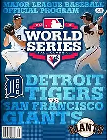 The 2012 World Series was the championship series of Major League Baseball's (MLB) 2012 season.[1] The 108th edition of the World Series, the series was a best-of-seven playoff between the National League (NL) champion San Francisco Giants and the American League (AL) champion Detroit Tigers; the Giants won in a four-game sweep. This marked the Giants' seventh World Series title in franchise history, their second in San Francisco (they won five in New York), and their second in a three-year period (2010–2012). Their World Series sweep was the first by an NL team since the Cincinnati Reds swept the Oakland Athletics in the 1990 series and the first NL sweep not by the Reds since 1963, when the Los Angeles Dodgers swept the New York Yankees. This was also the first World Series since 1988 to feature both of that year's League MVPs (Miguel Cabrera for the AL and Buster Posey for the NL). The Giants' Pablo Sandoval, who in Game 1 tied a record by hitting three home runs in one World Series game, two off Tigers' ace pitcher Justin Verlander, was named the World Series Most Valuable Player (MVP).