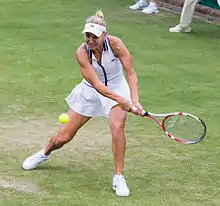 Pironkova is one of the wild card recipients, being a native of Bulgaria. She reached two quarterfinals in the year at the Topshelf Open and at 2013 Moorilla Hobart International. However, she was able to reach the fourth round of Wimbledon before losing to world no. 4 Agnieszka Radwańska 6–4, 3–6, 3–6.[48] In the other slams, Pironkova didn't fare well falling in the first rounds of the Australian Open to Romina Oprandi 6–4, 5–7, 2–6, French Open to Eugenie Bouchard 1–6, 6–7(7–9), and US Open to Alison Riske 3–6, 3–6.[49][50]