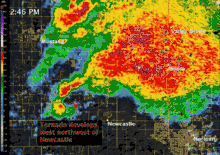 The tornado touched down at 2:56 p.m. CDT in northeastern Grady County, near Long Drive and the southwest corner of the North Country Club Road and Northwest 32nd Street intersection, roughly 4.4 miles (7.1 km) northwest of downtown Newcastle. Initially a narrow cone-shaped tornado, it first caused EF1 damage to a home and some trees before rapidly intensifying and striking a semi-rural subdivision on the north side of Northwest 32nd, where several homes were destroyed, two of which were leveled at EF4 intensity.[18] At this point, the tornado began to grow rapidly in size, evolving into a large, wedge-shaped structure. Slight ground scouring began in this area, and several homes in a subdivision further to the northeast sustained EF3 damage.[19][20] By 3:01 p.m. CDT, the National Weather Service issued a second, more strongly worded warning for the area: in a special weather statement that updated the existing tornado warning, the Norman forecast office declared a tornado emergency for southern Oklahoma City and Moore as various storm spotters confirmed that the large, violent tornado was approaching the area. The Twin Lakes dual-polarization NEXRAD radar (near Lake Stanley Draper) detected a tornado debris signature one mile in diameter within the accompanying hook echo, as the tornado crossed into portions of south Oklahoma City in northern Cleveland County.[21][22] The supercell also produced straight-line winds of 80 miles per hour (130 km/h) for at least one mile surrounding the tornadic circulation.[22]
