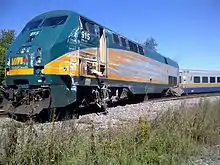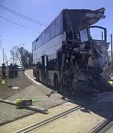 It occurred at a rail crossing near Fallowfield Road and Woodroffe Avenue on the Transitway, the city's dedicated road for buses.[1][5] The train had departed from Ottawa Train Station at 8:32AM and the bus had just departed from Fallowfield Transitway Station.[7] The bus had a total of eighty-three people aboard.[8] The level crossing's crossing gates, lights, and bells engaged 47 seconds before the crash, and its gates were fully horizontal across the road 25 seconds before the crash.[5] The train did not sound its whistle due to a municipal ban on train whistles being used between the times of 8:00PM and 12:00 noon.[7] However, the train's bell was activated.[7] The train was travelling at 75 kilometres per hour (47 mph), in an area where the speed limit is 161 kilometres per hour (100 mph), at the time of the collision and had engaged its emergency brakes 2 seconds prior.[5][7] The bus was travelling at 67.6 kilometres per hour (42 mph), in a zone where the speed limit was 60 kilometres per hour (37 mph), before the brakes were applied.[8] The bus' brakes were applied 3 seconds before the crash, though the full force of the brakes was not initially applied.[8] The collision sheared off the front end of the bus and derailed the train.[1][6]
