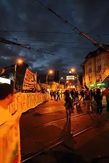 Although the protests are generally peaceful in conduct, some incidents were reported. In the first day of protests, a group of protesters tried to break into the government headquarters, but were stopped by gendarmes. Some teenagers who had joined the protesters jostled with law enforcement officers and threw firecrackers.[38] In Cluj-Napoca, protesters lit smoke-producing objects. In Bucharest, Timișoara and Iași, protesters installed tents on the roads, blocking the traffic on major arteries of circulation.[39]