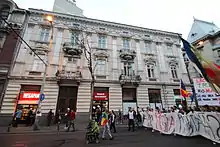 The protests were organized in cities across the country, with thousands of people in Bucharest and Cluj-Napoca. Protests were held across Europe, with an estimated 150–200 Romanians and environmentalists protesting in London.[26] The protests, organized during the evenings, involved the protesters blocking streets, drumming, singing and organizing sit-ins in the street.[25][26] In Berlin and Brussels (in front of the UNESCO Headquarters), the protests included a die-in. In Chicago, members of the Romanian community, solidary with the Roșia Montană protest movement, joined a spontaneous protest inside the consulate in Chicago. The protest took place at the Romanian Prime Minister's visit to the United States. People have made an open letter to Prime Minister Victor Ponta, through which they demand the ban of cyanide mining and shale gas exploitation in Romania.[27]