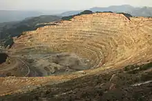 The Roșia Montană Project was initiated by Roșia Montană Gold Corporation, a company of which the largest shareholder is the Canada-based Gabriel Resources.[17] The company was given in 2000, without bidding, a license for mining gold.[18] The open-pit mining project will use cyanide to extract gold and it is expected to require the razing of three villages and destroying four mountain tops.[19] If approved, it would be Europe's largest open-pit gold mine and it will use 12,000 tonnes of cyanide yearly,[20][21] giving a yield of 350 tonnes of gold and 1,500 tonnes of silver.[19][22]