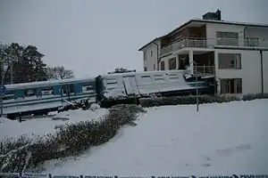 The 2013 Saltsjöbanan train crash occurred in the early morning hours of 15 January 2013.[2] A passenger train started to move without authorization, with only a cleaning lady on board. It overran a set of buffer stops and crashed into a block of flats in Saltsjöbaden, Sweden.[3] The cleaning lady was at first suspected of having "stolen" the train,[4] but was later cleared of blame, as the train was found to have started moving because of violation of safety procedures.[5][6]