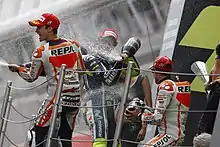 Dani Pedrosa, Valentino Rossi and Marc Márquez, spraying the champagne on the podium after finishing third, second and first in the MotoGP race.