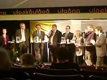 Hustings panel with Finnish political party chairpersons and top candidates on Europe Day 2014. Left to right: Sari Essayah, Mikael Pentikäinen, Jyrki Katainen, Timo Soini, Carl Haglund, Liisa Jaakonsaari, Paavo Arhinmäki, Ville Niinistö.