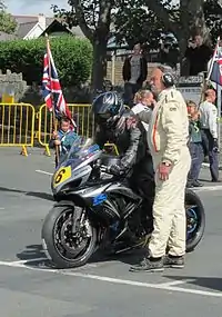![]() Andrew Soar (6) 750 cc Suzuki at startline, 2014 Senior Manx Grand Prix, 29 August 2014 | |||