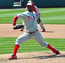 The Phillies began a road trip with a three-game series against the Colorado Rockies. In game one, Pettibone gave up eight runs in four innings; with two hits, the Phillies lost 12–1. After the game, Pettibone was sent to the Triple-A (AAA) Lehigh Valley IronPigs.[112] Although Kendrick had a quality start in the second game, the Phillies scored one run in a 3–1 loss.[113] They salvaged the final game of the series, winning 10–9 despite Hernandez giving up six runs in four innings; Ryan Howard was four-for-five at the plate, including a home run, a triple and three RBIs. The Phillies lost the lead three times before winning the game.[114] The team then opened a four-game series against the Los Angeles Dodgers. Lee pitched a "gem" of a game, striking out 10 batters in eight shutout innings; Carlos Ruiz, in the cleanup spot, hit two doubles and a home run for four RBIs (his first of the season) for the Phillies' 7–0 win.[115] They won the second game in 10 innings; Brown doubled, scoring Ruiz in the top of the 10th for a 3–2 lead held by Papelbon for his sixth save. Burnett had a good outing, and several relievers provided "stress-free performances" for the victory (which brought the team's winning percentage to .500).[116] The Phillies lost game three, Cole Hamels' season debut after an injury, 5–2; although Hamels had a quality start, the bullpen gave up three runs and the offense had five hits and struck out 13 times.[117] Kendrick pitched the final game of the series for a 7–3 win, behind strong offense from Ruiz (who reached base in all five plate appearances, scoring twice and driving in two runs) and Byrd (who had four RBIs).[118] In game two the Phillies rallied from a 5–0 deficit to win, 6–5. Ruiz was three-for-four, with two runs and an RBI; Gwynn had a pinch-hit RBI double, and Asche had a pinch-hit two-RBI double for the Phillies (who scored all their runs in the seventh and eighth innings). Papelbon recorded his seventh save.[119] The Phillies finished the road trip with a 2–0 victory behind a "brilliant" Burnett, for a 6–4 record on the trip.[120] For his .500 batting average on the road trip, Ruiz was named the NL Player of the Week.[121]