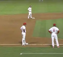 A lack of rapport between veteran shortstop Jimmy Rollins and manager Ryne Sandberg attracted attention during the offseason; ESPN's Buster Olney described sentiment in the Phillies' organization that Rollins should be traded.[61] Amaro and Rollins dispelled the rumors, with Amaro calling them "absolute silliness".[62] Sandberg praised backup shortstop Freddy Galvis' attitude (which many in the media saw as the manager sending a message to the team that no one – including Rollins – was above team rules),[63] and one column examined the point at which Rollins ceased being the team's unquestioned leader.[64] Rollins (who had a good relationship with former manager Charlie Manuel) said, "He's [Sandberg's] completely different from Charlie from the very onset, their personalities. He's pretty much a real quiet guy, he really is. Charlie was a get-in-your face with jokes type of guy. We're still learning him, he's still learning us from this side of it. Being a coach and being a manager are completely different things – you deal with so much more being a manager."[65]