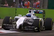 On lap 23, Räikkönen drew closer to Massa and the Williams team responded by bringing the latter into the pit lane for soft compound tyres for a potential strategic overtake. He rejoined in ninth behind teammate Bottas.[36][40][41] Hamilton pulled away from Vettel who was caught by Alonso. By the 24th lap, Alonso had the potential to pass Vettel after the pit stops. That lap, Ferrari brought Alonso into the pit lane for super soft compound tyres.[36] Vettel made his pit stop on lap 25 for soft compound tyres and emerged in third behind Alonso's faster Ferrari.[40] Massa overtook Hülkenberg on the main straight for eighth on the same lap.[39] Hamilton made his stop for super soft compound tyres on the following lap, giving the lead to Ricciardo; his team used a large time gap to remove rubber debris on his front wing.[36] Ricciardo took his pit stop on lap 27 returning the lead to Hamilton. Grosjean was close behind Pérez but he could not pass him.[38] Pérez attempted an overtake Sutil on the straight on the 30th lap,[36] and Sutil squeezed Pérez into a wall, clipping the left-front nose cone section. It slid under Pérez's wheel, littering the track with debris, and prompting the safety car's deployment,[39] to allow marshals to remove debris from the track.[40]