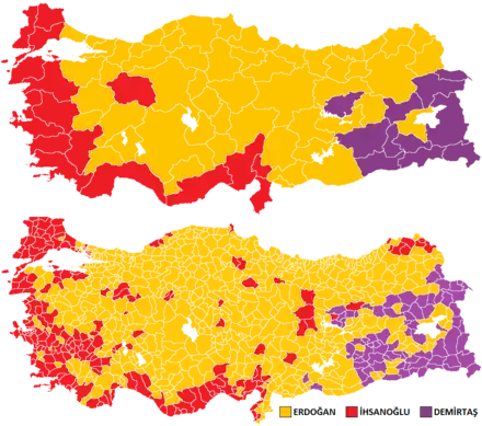 Maps showing the winners by province (top) and by district (bottom). Yellow denotes those won by Recep Tayyip Erdoğan, red denotes those won by Ekmeleddin İhsanoğlu, purple denotes those won by Selahattin Demirtaş.
