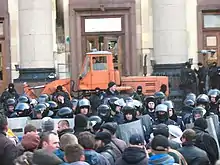 On 1 March, regional state administration (RSA) buildings in various eastern Ukrainian oblasts were briefly occupied by pro-Russian activists. By 11 March, all occupations had ended, after units of the local police and the Security Service of Ukraine (SBU) re-took the buildings.[59] In Donetsk, protests escalated into violence on multiple occasions, including on 13 March, when a pro-Ukrainian protester was stabbed to death.[60][61] In Kharkiv, Patriots of Ukraine militants killed an anti-Maidan protester and a passer-by on the night of 15 March, when anti-Maidan protesters attacked the Right Sector headquarters in the city.[36]