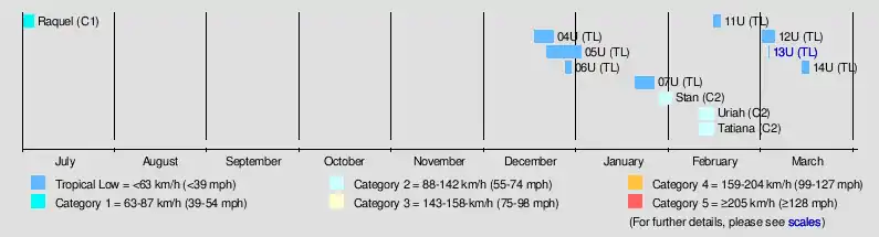 | 11 systems | 17 December – 16 March | 110 km/h (70 mph) | 975 hPa (28.79 inHg) | Minor | 0 | ||||