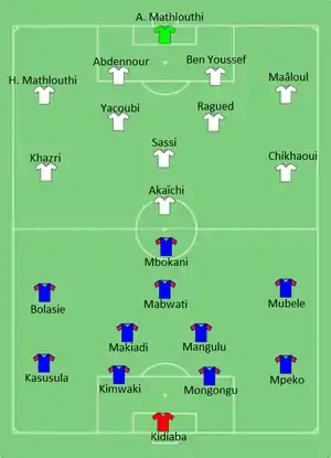 Tunisia took the lead in the 31st minute, as Yassine Chikhaoui's shot was deflected and Ahmed Akaïchi headed the ball in. DR Congo equalized in the 66th minute, after Dieumerci Mbokani headed down a long ball for Jeremy Bokila to score. The result was enough for Tunisia to win the group, while DR Congo also qualified as runners-up, ahead of Cape Verde on goals scored.[17][18]