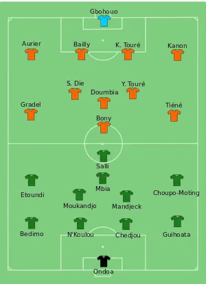 The only goal of the match was scored by Max Gradel in the 35th minute, as he stole the ball from the Cameroon defence, dribbled inside and shot home from outside the penalty area. The win sent Ivory Coast to the quarter-finals as group winners, while Cameroon were eliminated.[17][18]