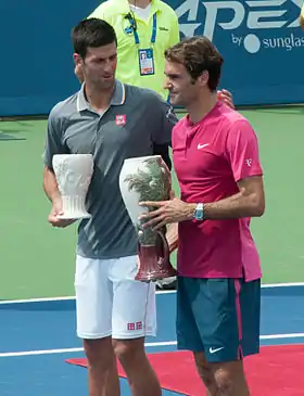 Federer began his summer hard court season at the Cincinnati Open as the second seed and defending champion. He defeated Roberto Bautista-Agut in the second round in straight sets before crushing Kevin Anderson in the third round to advance to the quarterfinals. He beat Feliciano López in straight sets to set up a semifinal clash against Andy Murray. In the semifinal he beat Murray in two tight sets to advance to the final. In the final, he met world No. 1, Novak Djokovic and defeated him in straight sets to win a record 7th Cincinnati title and also deny Djokovic from achieving an historic Career Golden Masters. The win saw Federer regain the No. 2 ranking. It also marked the second time that Federer did not lose a set or have his serve broken at a Masters 1000, having achieved this record at the same tournament back in 2012. This was also the first time that Federer had beaten the Top 2 players in the world at the same tournament, although this feat hadn't been possible during the years that Federer was ranked in the top 2 himself.