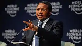 The ruling CCM (and its predecessor parties) has dominated the political scene since the nation attained independence in 1961. Following the restoration of multi-party politics in 1992, it has retained its popularity and the voters' confidence, winning all of the past four general elections (held in 1995, 2000, 2005 and 2010).[26] Jakaya Kikwete, its presidential candidate in 2005, won by a landslide, receiving more than 80 percent of the popular vote.[27] In the last election in 2010, Kikwete won his second and final term, albeit by a reduced margin.[28]