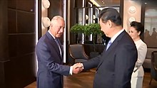 Xi and Peng had lunch with the Queen, viewed the Royal Collection's Chinese artefacts, and exchanged gifts with the Royals, giving them two albums of Peng Liyuan's music.[8] In the afternoon, Xi Jinping made a speech at the Palace of Westminster. He focused on historic bi-national ties, law and order, and China's burgeoning economy in this speech. He also cited Shakespeare's The Tempest, that "what's past is prologue".[17] Later Xi Jinping visited the Clarence House, the residence of Prince William, and had tea with the prince. In the evening, Xi and Peng arrived for a state banquet at the Buckingham Palace, hosted by the Queen. Xi also met with the Labour leader Jeremy Corbyn.[8] After the banquet, Xi and Peng stayed two nights at the palace in the Belgian Suite.[18][19]