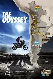 The 2016 Dakar Rally was the 38th edition of the event and the eighth successive year that the event was held in South America. The event started in Buenos Aires, Argentina on January 2, then ran through Argentina and Bolivia.[1]