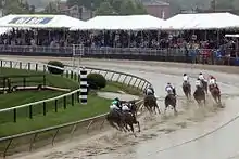 On a rainy day, the race went off at 6:52 PM, EST.[1] In spite of the weather, attendance was a record-breaking 135,256, beating the previous year's record of 131,680. The pari-mutuel take of $94,127,434 for the entire day's races also broke the previous record of $91,028,000 in 2005.[13]
