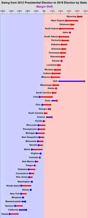 ![]() Presidential election results map. Red denotes states won by Trump/Pence and blue denotes those won by Clinton/Kaine. Numbers indicate electoral votes cast by each state and the District of Columbia. Trump received 304 and Clinton 227, as 7 faithless electors, 2 pledged to Trump and 5 to Clinton, voted for other candidates. | |||||||||||||||||||||||||||||