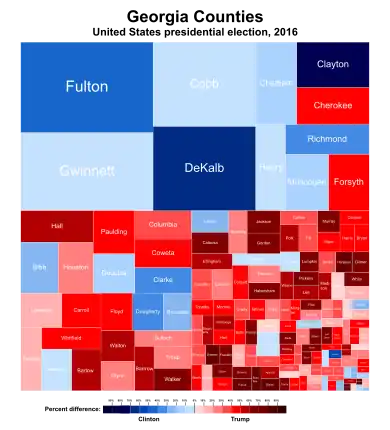 Trump won Georgia by 5.1%, a lower margin compared to Mitt Romney's 7.82% in 2012 and even John McCain's 5.20% in 2008. Clinton received 45.35% of the vote, making this a state where she performed slightly worse than Barack Obama's 45.48% in 2012.[3] Nevertheless, Trump's reduced margin of victory also made Georgia one of eleven states (plus the District of Columbia) to vote more Democratic in 2016 than in 2012.[4] The Atlanta metropolitan area in particular shifted strongly Democratic compared to 2012, with Clinton becoming the first Democrat to win Henry County since 1980, and the first Democrat to win Gwinnett County and Cobb County since 1976, when Georgia native Jimmy Carter won all of the state's counties. This is the most recent election in which a Republican won Georgia's electoral votes, as this trend would be narrowly bucked by Joe Biden four years later.[5]