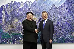 North and South Korea marched together in the Olympics opening ceremony and fielded a united women's ice hockey team.[148] As well as the athletes, North Korea sent an unprecedented high-level delegation, headed by Kim Yo-jong, sister of Kim Jong-un, and President Kim Yong-nam, and including performers like the Samjiyon Orchestra.[149] The delegation passed along an invitation to President Moon to visit North Korea.[149]