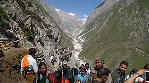 The 48-day July–August annual Hindu pilgrimage, undertaken by up to 600,000 or more pilgrims to the 130 feet (40 m)-high glacial Amarnath cave shrine of iced stalagmite Shiv linga at 12,756 feet (3,888 m) in Himalayas, is called Amarnath Yatra.[11][12][13] It begins with a 43 kilometres (27 mi) mountainous trek from the Nunwan and Chandanwari base camps at Pahalgam and reaches the cave-shine after night halts at Sheshnag Lake and Panchtarni camps.[14]