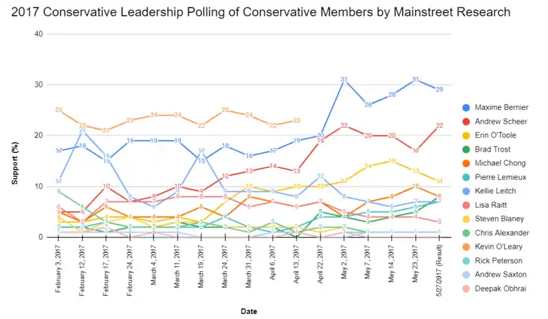 - iPolitics Updated (May 25, 2017). "Bernier has 85 per cent chance of winning Conservative leadership: final Mainstreet poll". Ipolitics.ca. Retrieved July 8, 2017.