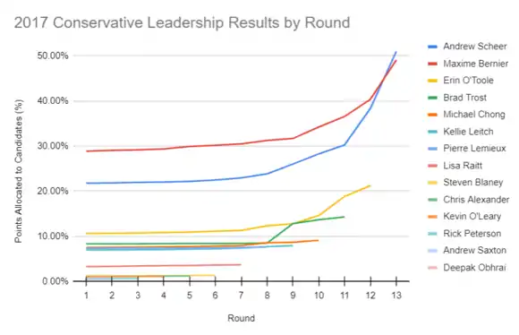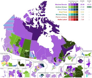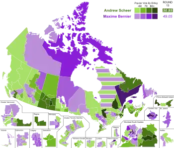 259,010 party members were eligible to vote in the leadership contest.[5] 141,000 members cast a vote. According to raw voting figures, Scheer received 62,593 votes on the final ballot compared to 55,544 votes for Bernier with 23,000 voters who had voted in the first round ranking neither Scheer or Bernier in their ranked ballot. Votes were apportioned among ridings so that each riding was allocated 100 points, regardless of the number of voters, resulting in 17,222.20 points (50.95%) for Scheer and 16,577.80 points (49.05%) for Bernier.[6]
