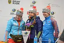 Svetlana Sleptsova, Irina Starykh and Juliya Dzhyma at the winner's press conference after the women's sprint race