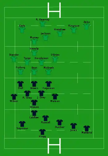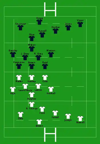 | Try: Russell 27' c Scott 37' m Visser 61' c Seymour 72' c Con: Russell (3/4) 28', 62', 73' Pen: Hogg (1/1) 5' |