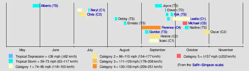 Tropical cyclogenesis began with the formation of Tropical Storm Alberto on May 25, marking the fourth consecutive year that activity began early.[18] However, no storms developed in the month of June. July saw the formation of Beryl and Chris, both of which intensified into hurricanes. August also featured two named storms, Debby and Ernesto, though neither strengthened further than tropical storm status. On August 31, the depression that would later become Hurricane Florence developed. September featured the most activity, with Florence, Gordon, Helene, Isaac, Joyce, Tropical Depression Eleven, Kirk, and Leslie also forming or existing in the month.[19] Florence, Helene, Isaac, and Joyce existed simultaneously for a few days in September, becoming the first time since 2008 that four named storms were active at the same time.[18] The season also became the second consecutive year with three hurricanes simultaneously active.[21]
