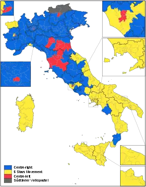 ![]() Election results maps for the Chamber of Deputies (on the left) and for the Senate (on the right). On the left, the color identifies the coalition which received the most votes in each province. On the right, the color identifies the coalition which won the most seats in respect to each Region. Blue for the Centre-right coalition, Yellow for the Five Star Movement, and Red for the Centre-left coalition. | |||||||||||||||||||||||||||||||||||||