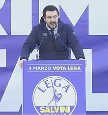In May 2017, Matteo Salvini was re-elected federal secretary of the LN and launched his own bid.[33][34] Under Salvini, the party had emphasised Euroscepticism, opposition to immigration and other populist policies.[35] In fact, Salvini's aim had been to re-launch the LN as a "national" or, even, "Italian nationalist" party, withering any notion of northern separatism. This focus became particularly evident in December when LN presented its new electoral logo, without the word "Nord".[36]