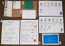 The voting paper, which is a single one for the first-past-the-post and the proportional systems, shows the names of the candidates to single-member constituencies and, in close conjunction with them, the symbols of the linked lists for the proportional part, each one with a list of the relative candidates.[123]