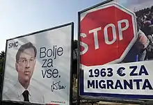 Hungary's Prime Minister Viktor Orbán, an ally of Janez Janša, came to stump with Janša in mid-May at a rally in Celje, declaring: "If Europe surrenders to mass population movement and immigration, our own Continent will be lost [...] The aim is to settle among us people who do not belong to our culture, and who will want to live here according to their own religions and customs".[34] The Slovenian Democratic Party (SDS) would also run on an anti-immigration platform.[35] One of the SDS's posters depicts migrants and refugees behind a stop sign. In a pre-election debate, a party lawmaker said that "no migrants means a secure Slovenia".[36] Hence, a frequent topic of election debates was hate speech, especially due to Janez Janša and other members of SDS, who are frequently involved in discussions which include hate speech, especially on Twitter. Lucija Ušaj and Žan Mahnič MP, both SDS and candidates in the elections, were exposed because of their activity on Twitter, where they frequently publish statements that can arguably be recognized as hate speech against homosexuals, migrants, Muslims, or political opponents.[37]